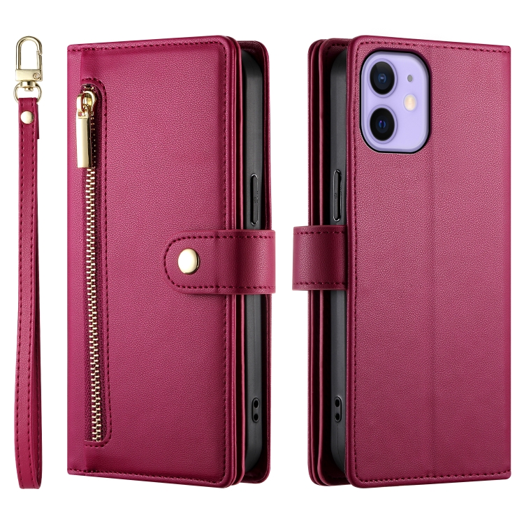 Funda de Cuero para Teléfono iPhone 12 Mini con 9 Ranuras para Tarjetas y Cremallera (Rojo)