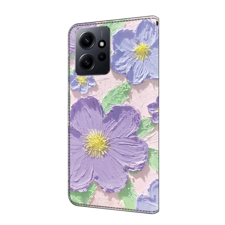 Funda de Cuero Pintada a Mano para Redmi Note 12 4G Global Fresh Painted Phone Case (Pintura al Óleo con Flores Moradas)