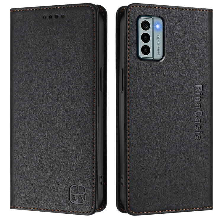 Funda de Cuero Rfid con Doble Pliegue y Succión Magnética para Nokia G22 Rc01 (Negra)