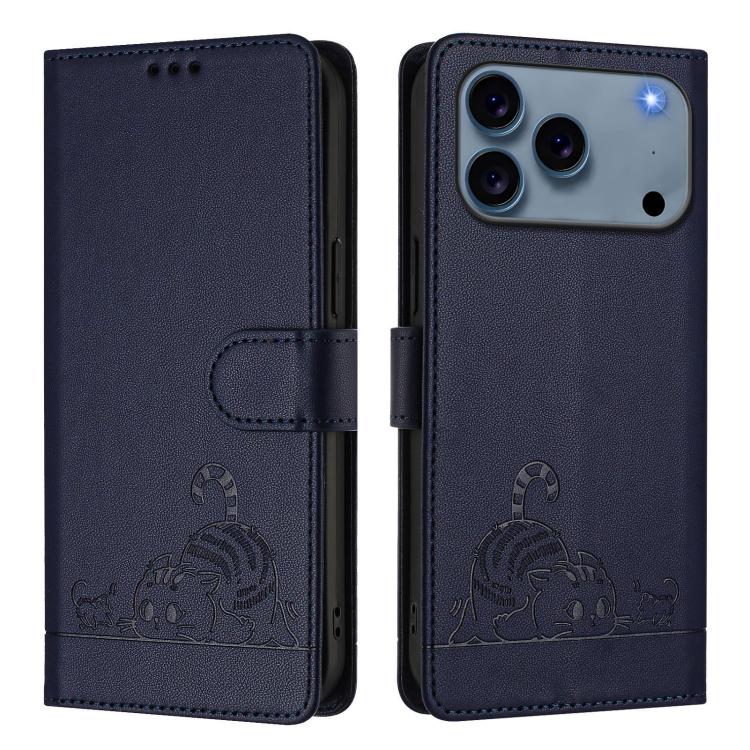 Funda de cuero RFID con estampado de gato y rata en relieve para iPhone 17 Pro Max con cordón (azul)