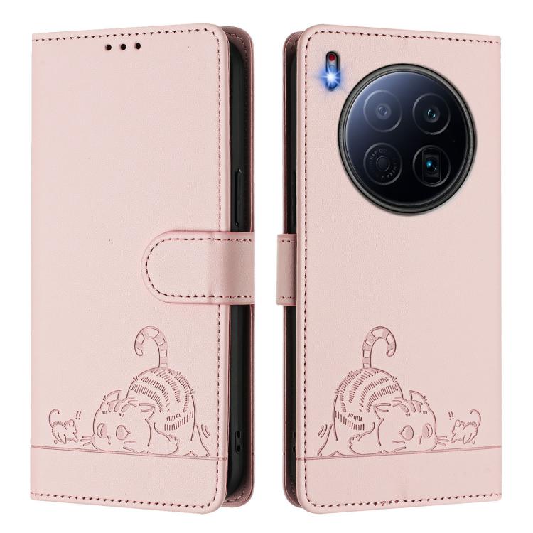 Funda de cuero RFID con estampado de gato y rata en relieve para Tecno Camon 40 Premier con cordón (rosa)