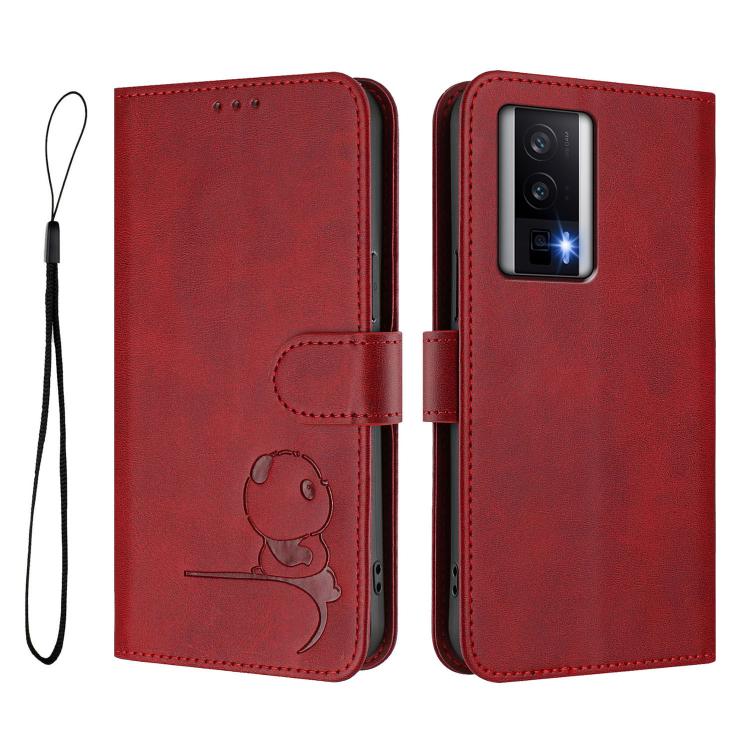 Funda de cuero RFID con estampado de panda y cordón para Redmi K60 / K60 Pro / Poco F5 Pro (rojo vino)