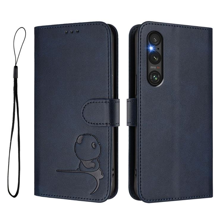 Funda de cuero RFID con estampado de panda y cordón para Sony Xperia 1 V (azul)