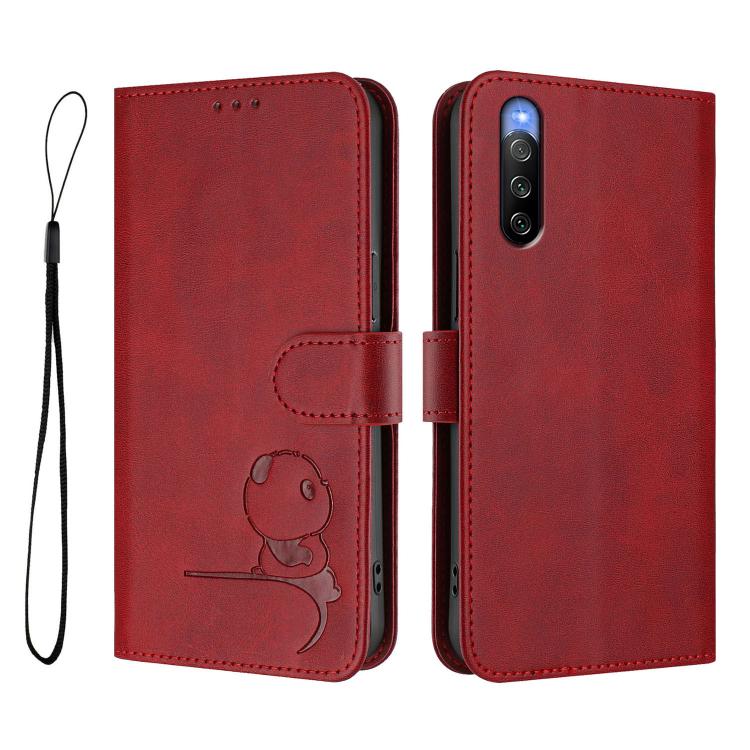 Funda de cuero RFID con estampado de panda y cordón para Sony Xperia 10 V (rojo vino)