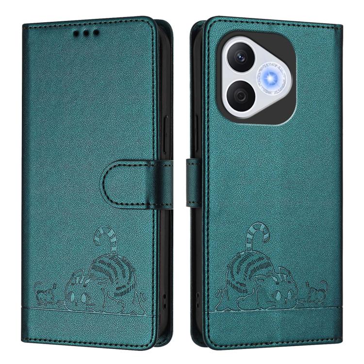 Funda de Cuero RFID Honor 400 Lite con Estampado de Rata y Gato en Relieve y Cordón (Verde Pavo Real)
