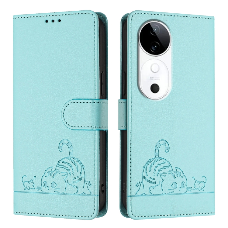 Funda de Cuero Rfid con Estampado de Rata y Gato En Relieve para Vivo S19 con Cordón (Verde Menta)