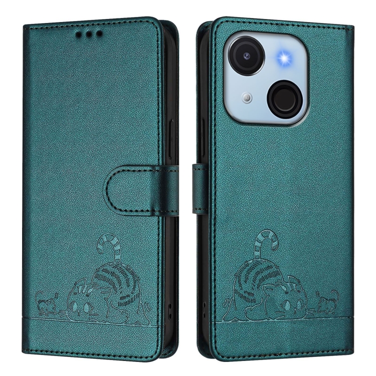 Funda de Cuero Rfid Itel A50C con Estampado de Rata y Gato y Cordón (Verde Pavo Real)
