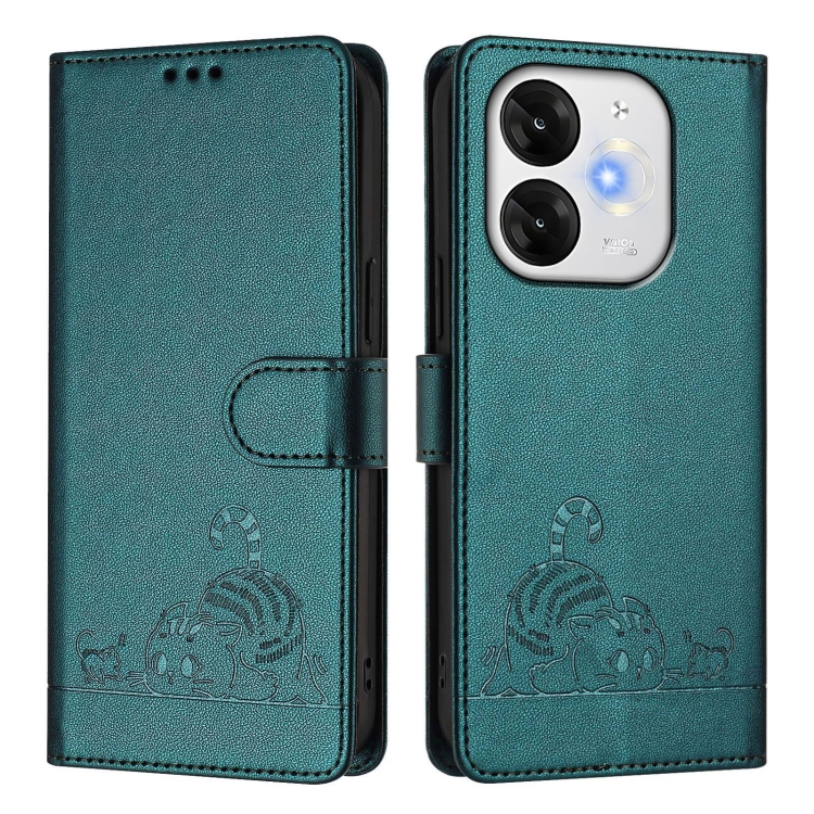 Funda de Cuero Rfid para Teléfono Itel A80 4G con Cordón Estampado Rata y Gato (Verde Pavo Real)