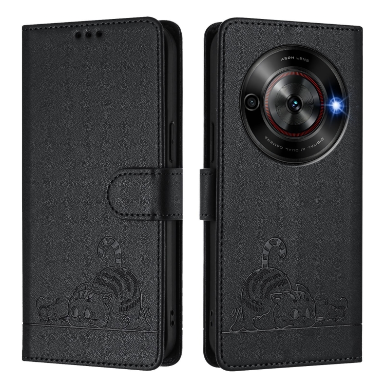 Funda de Cuero Rfid para ZTE Blade A75 5G con Estampado de Rata y Gato y Cordón (Negro)