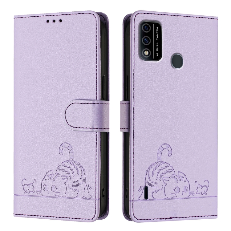 Funda de Cuero Rfid para Teléfono Itel A48 con Estampado en Relieve de Gato y Rata y Cordón (Morado)