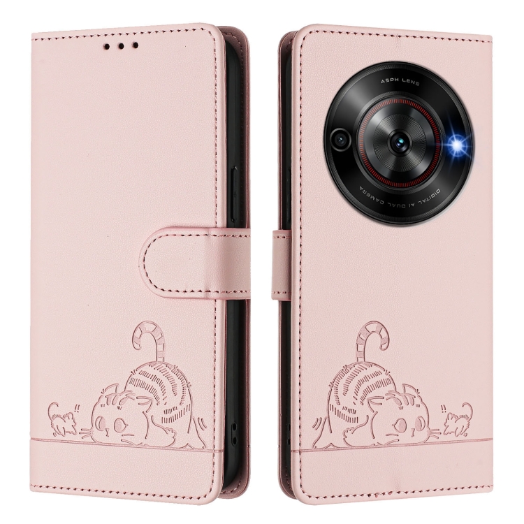 Funda de Cuero Rfid para ZTE Blade A75 5G con Estampado en Relieve de Gato y Rata y Cordón (Rosa)