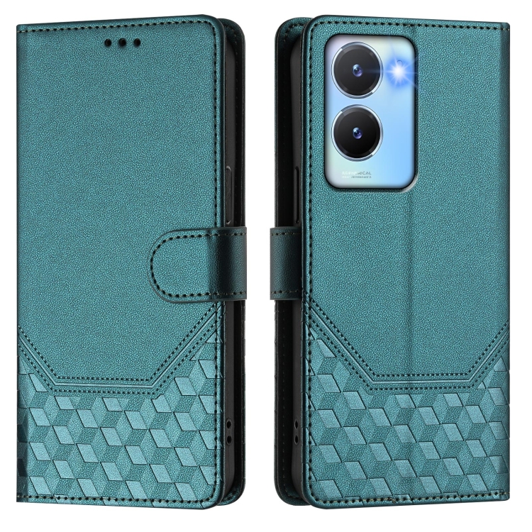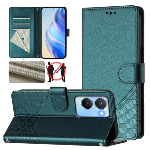 Funda de Cuero Rfid con Relieve de Panal Global para Vivo Y56 5G / Y16 4G / Y02S 4G (Verde Pavo Real)