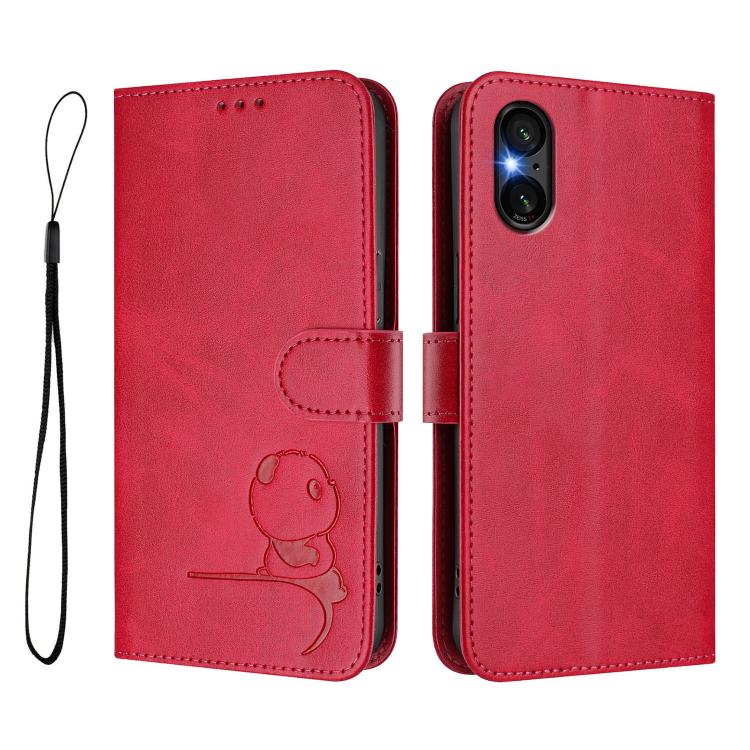 Funda de cuero RFID con relieve de panda para Sony Xperia 5 VI con cordón (rosa)