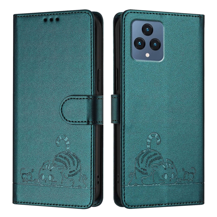Funda Cuero Rfid con Relieve Rata de Gato para T-Mobile Revvl 6/6X 5G con Cordón (Verde Pavo Real)