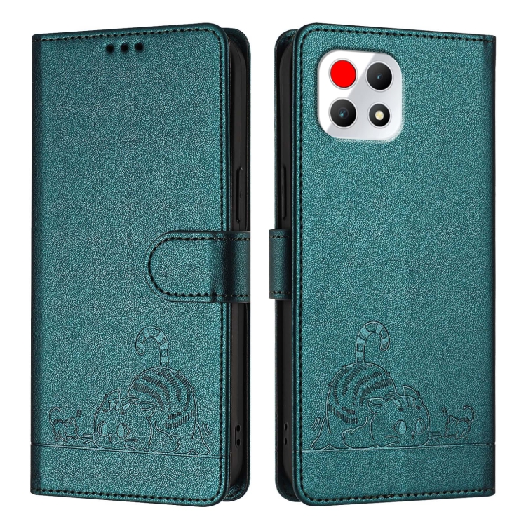 Funda de Cuero Rfid para T-Mobile Revvl 7 5G con Relieve de Rata y Gato y Cordón (Verde Pavo Real)