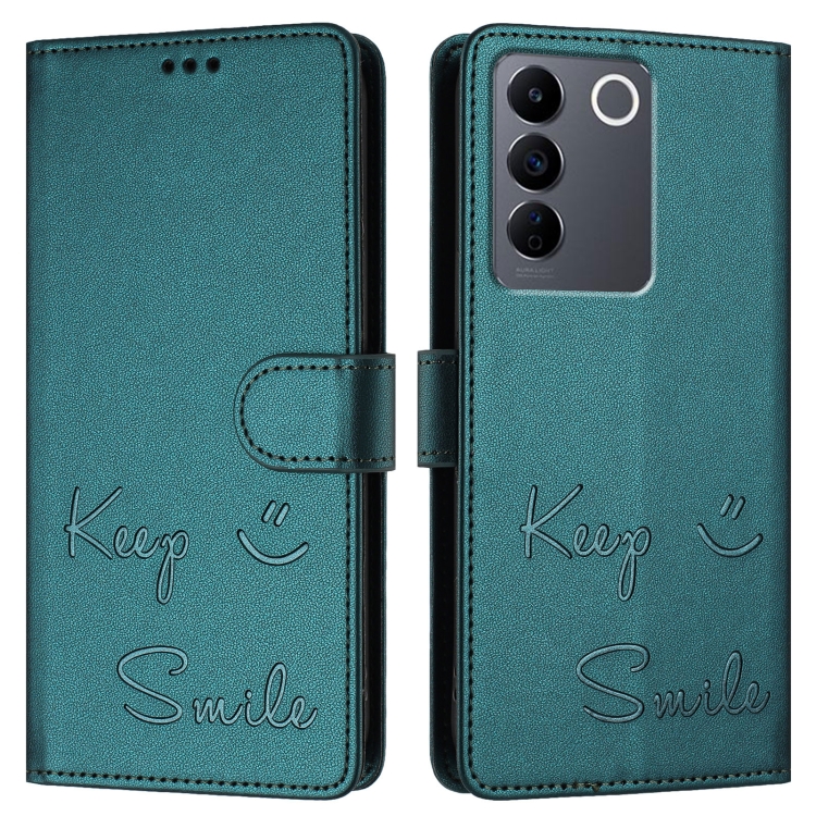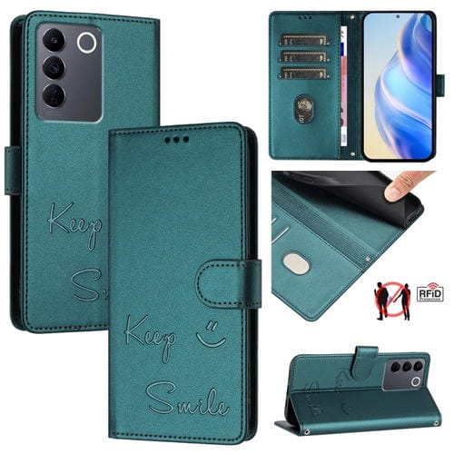 Funda de Cuero Rfid con Relieve de Sonrisa Global para Vivo V27 5G (Verde Pavo Real)