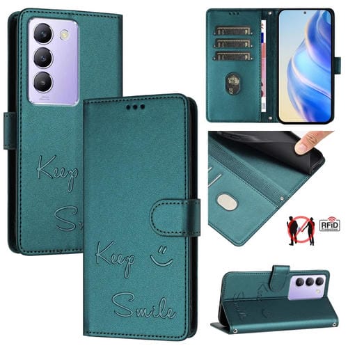 Funda de Cuero Rfid con Relieve de Sonrisa Idn para Vivo Y100 5G (Verde Pavo Real)