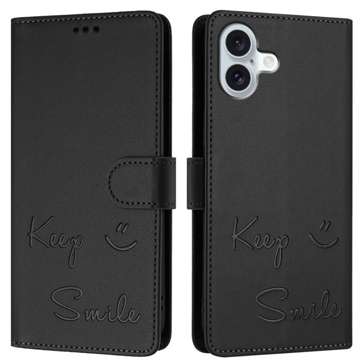 Funda de Cuero Rfid para iPhone 16 Plus con Relieve de Sonrisa (Negra)