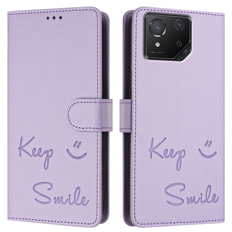 Funda de Cuero Rfid con Relieve Sonriente para Asus Rog Phone 8/8 Pro (Morado Claro)