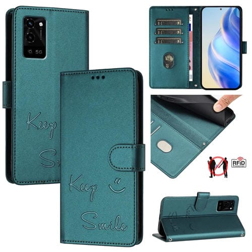Funda de Cuero Rfid con Relieve Sonriente para Oppo A16/A16S/A55S 5G (Verde Pavo Real)
