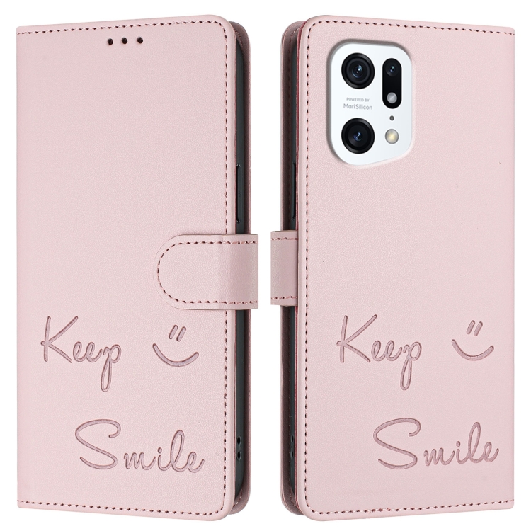 Funda de Cuero Rfid con Relieve Sonriente para Oppo Find X5 (Rosa)
