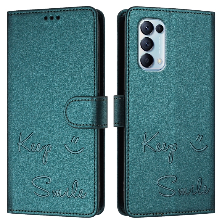 Funda de Cuero Rfid con Relieve Sonriente para Oppo Reno5 4G/Reno5 5G (Verde Pavo Real)