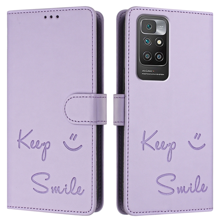 Funda de Cuero Rfid con Relieve Sonriente para Redmi 10 / Redmi 10 2022 (Morado Claro)