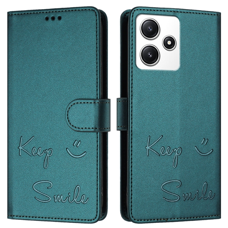 Funda de Cuero Rfid con Relieve Sonriente para Redmi 12 5G Global/India (Verde Pavo Real)