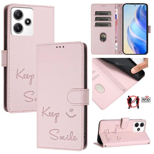 Funda de Cuero Rfid con Relieve Sonriente para Redmi Note 12R (Rosa)