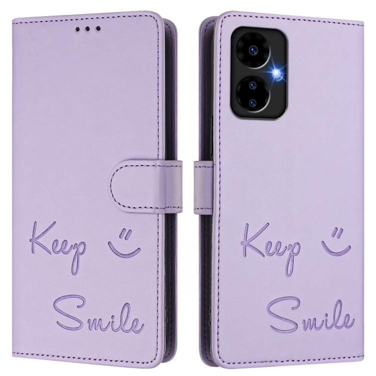 Funda de Cuero Rfid con Relieve Sonriente para Boost Mobile Celero 5G (2024) (Morado Claro)
