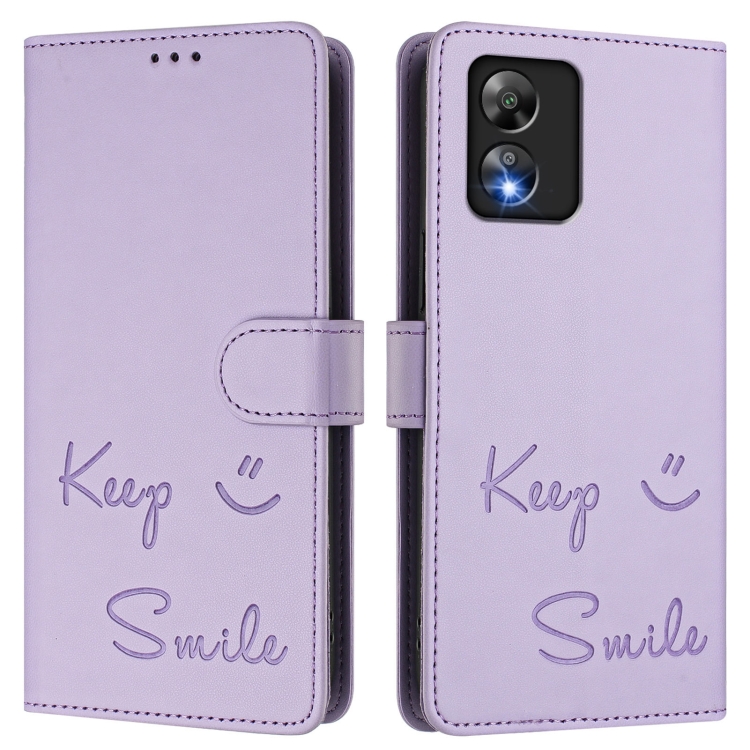 Funda de Cuero Rfid Boost Mobile Celero 5G Sc con Relieve Sonriente (Morado Claro)