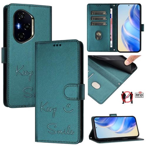 Funda de Cuero Rfid con Relieve Sonriente para Honor 300 Pro 5G y 300 Ultra 5G (Verde Pavo Real)