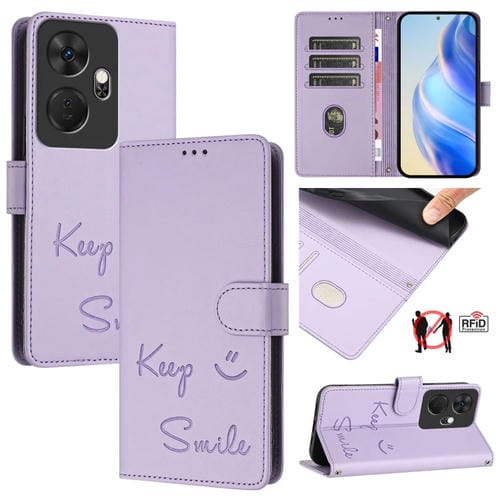 Funda de Cuero Rfid con Relieve Sonriente para Teléfono Itel P55+ (Morado Claro)