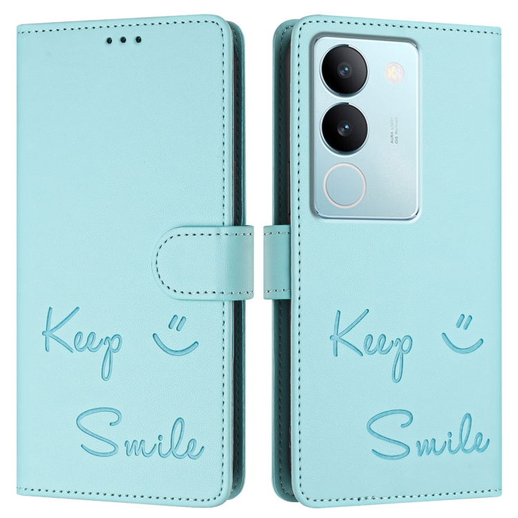 Funda de Cuero Rfid con Relieve Sonriente para Vivo V29 5G Global/V29 Pro (Verde Menta)