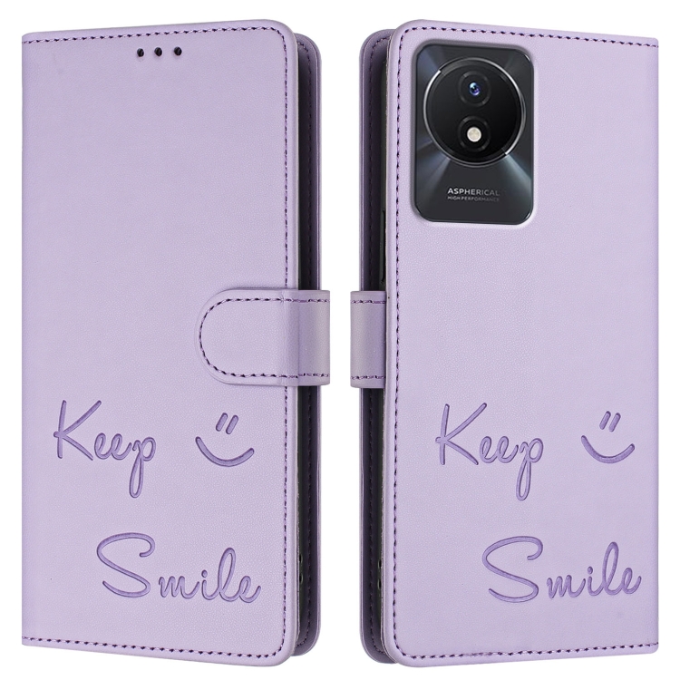 Funda de Cuero Rfid con Relieve Sonriente para Vivo Y02A 4G / Y02 4G (Morado Claro)