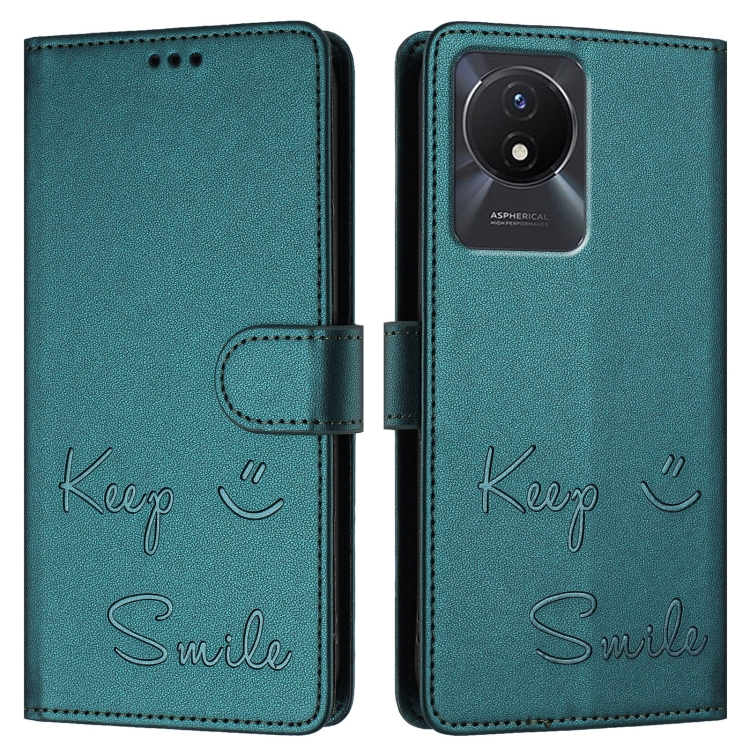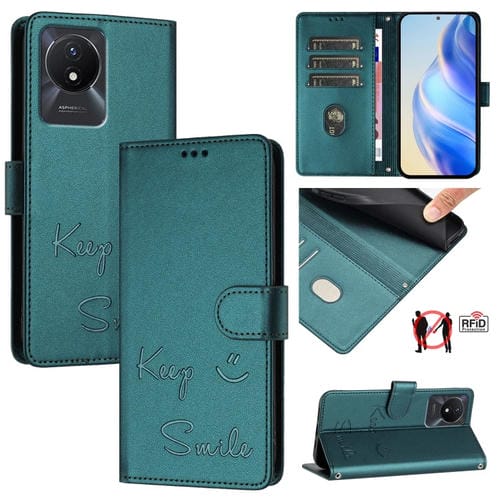 Funda de Cuero Rfid con Relieve Sonriente para Vivo Y02A 4G/Y02 4G (Verde Pavo Real)
