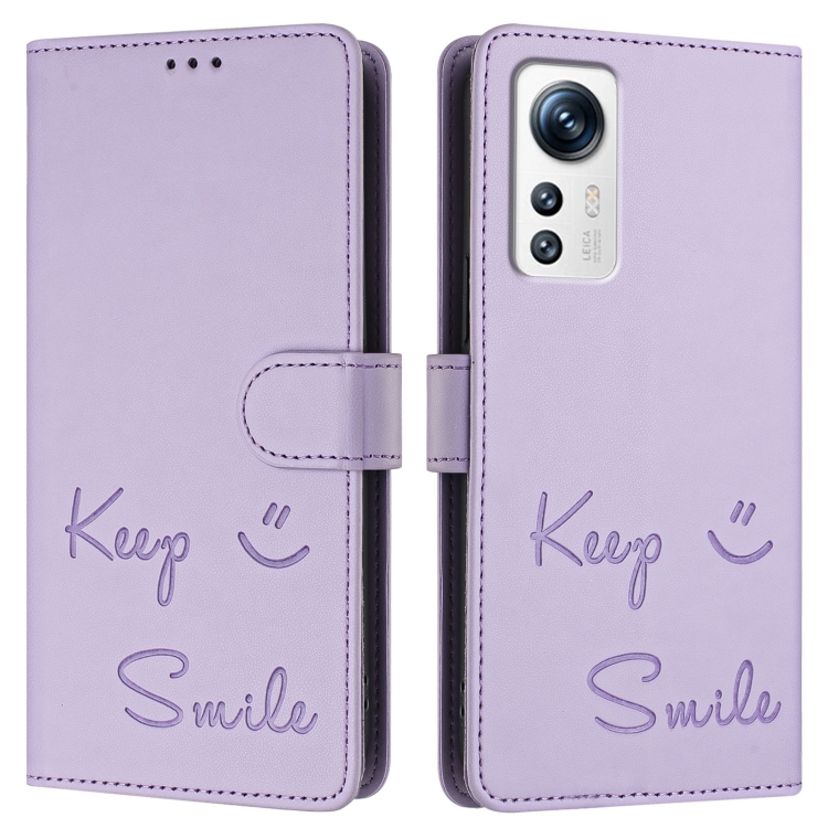 Funda de Cuero Rfid con Relieve Sonriente para Xiaomi 12/12X/12S (Morado Claro)