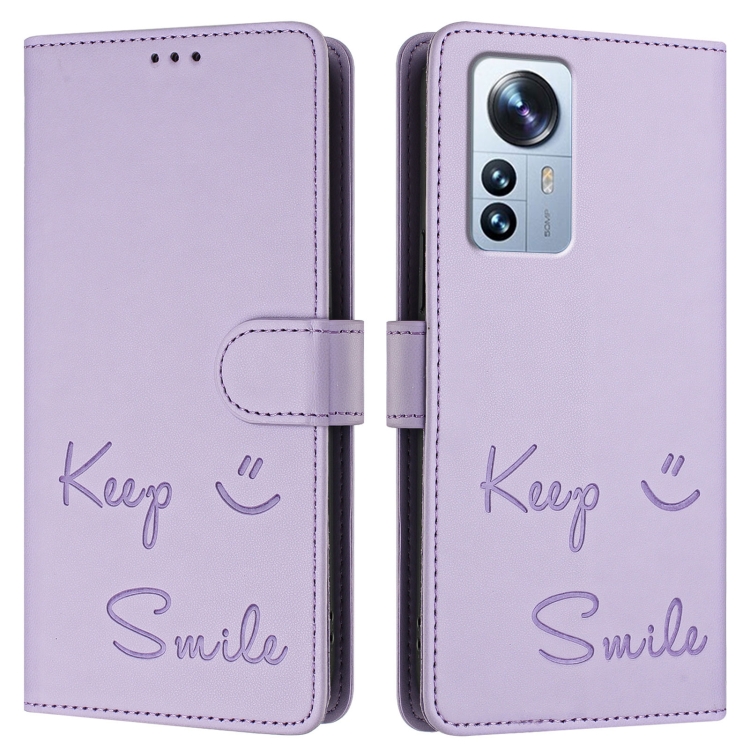 Funda de Cuero Rfid con Relieve Sonriente para Xiaomi 12 Pro/12S Pro (Morado Claro)