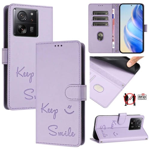 Funda de Cuero Rfid con Relieve Sonriente para Xiaomi 13T/13T Pro (Morado Claro)