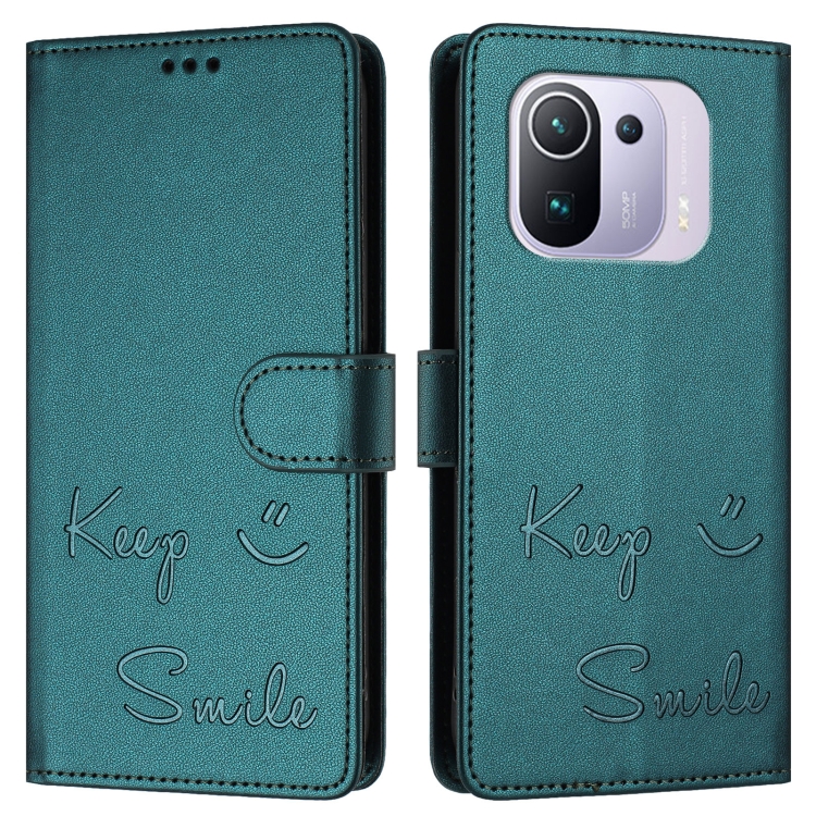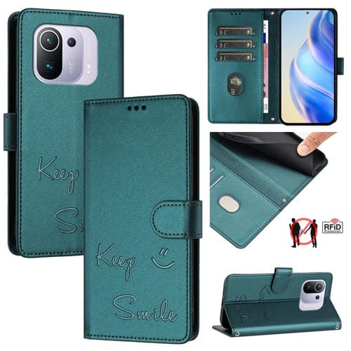 Funda de Cuero Rfid con Relieve Sonriente para Xiaomi Mi 11 Pro (Verde Pavo Real)