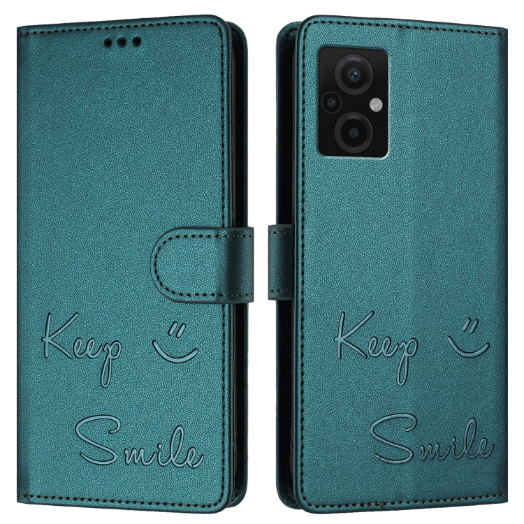 Funda de Cuero Rfid con Relieve Sonriente para Xiaomi Poco M4 5G/Poco M5 4G (Verde Pavo Real)