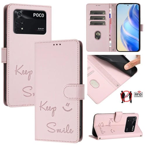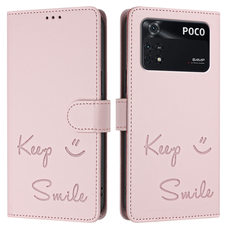 Funda de Cuero Rfid con Relieve Sonriente para Xiaomi Poco M4 Pro 4G (Rosa)