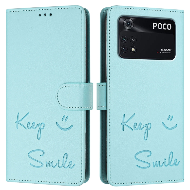 Funda de Cuero Rfid con Relieve Sonriente para Xiaomi Poco M4 Pro 4G (Verde Menta)