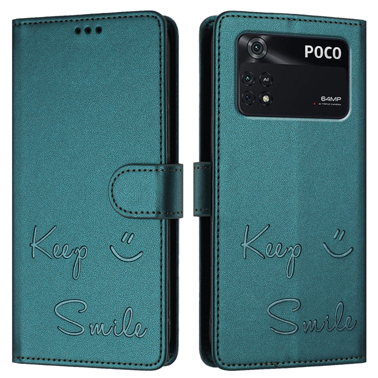 Funda de Cuero Rfid con Relieve Sonriente para Xiaomi Poco M4 Pro 4G (Verde Pavo Real)