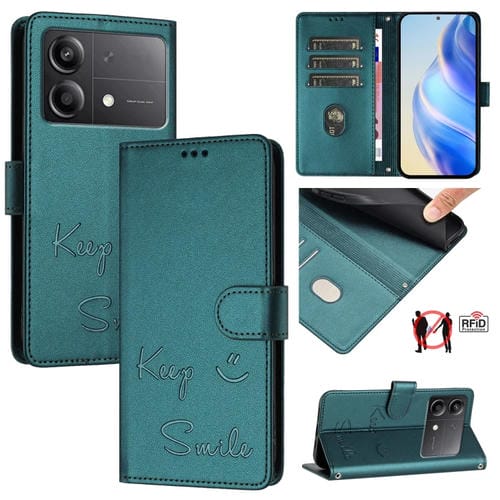 Funda de Cuero Rfid con Relieve Sonriente para Xiaomi Poco X6 Neo (Verde Pavo Real)