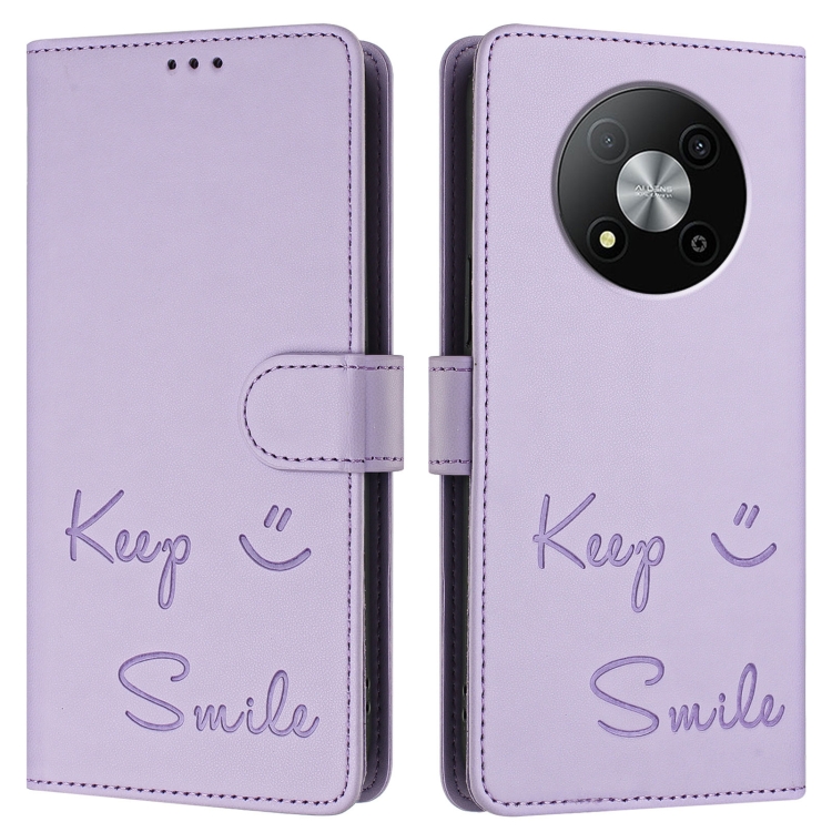 Funda de Cuero Rfid con Relieve Sonriente para ZTE Blade A73 5G (Morado Claro)