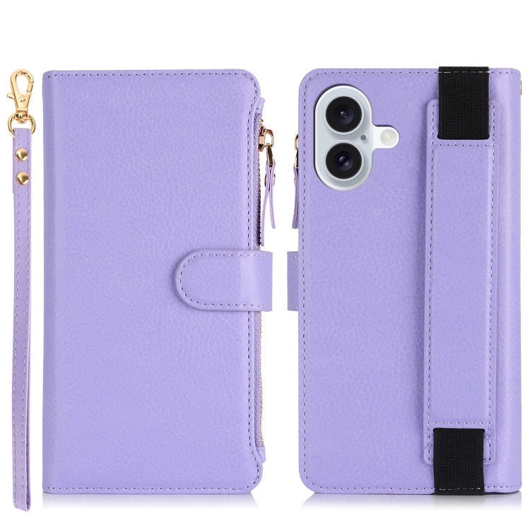 Funda de Cuero Rfid para iPhone 16 Plus con Cierre de Cremallera y Correa para la Muñeca (Morado)