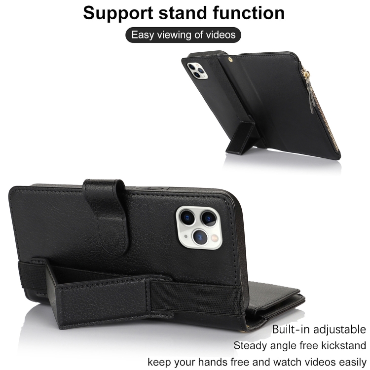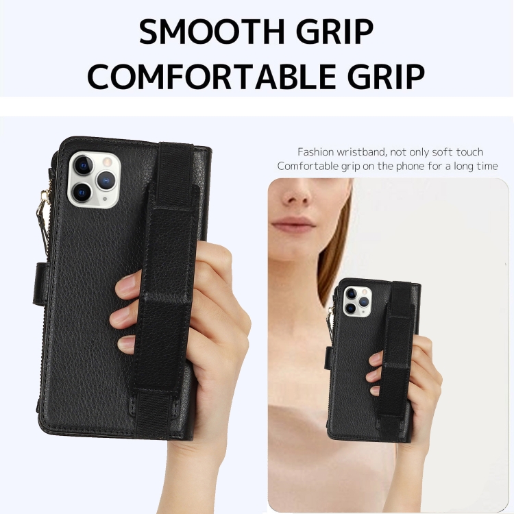 Funda de Cuero Rfid para Teléfono iPhone 11 Pro Max con Cierre de Cremallera y Soporte para Pulsera (Negro)