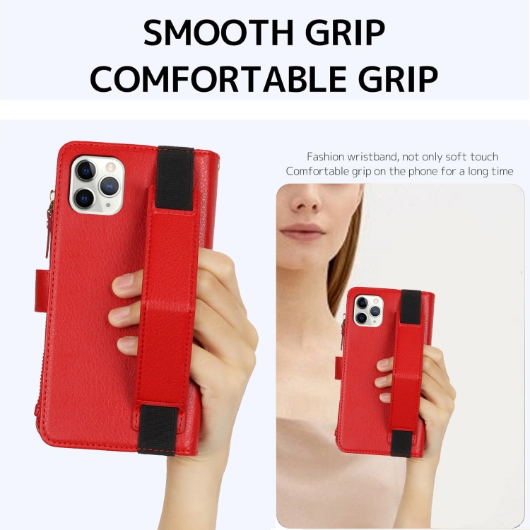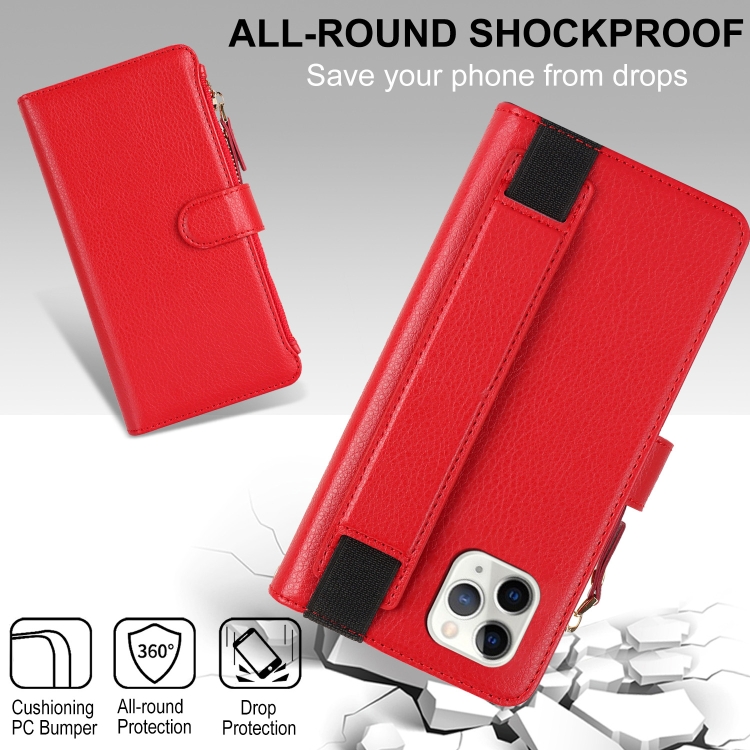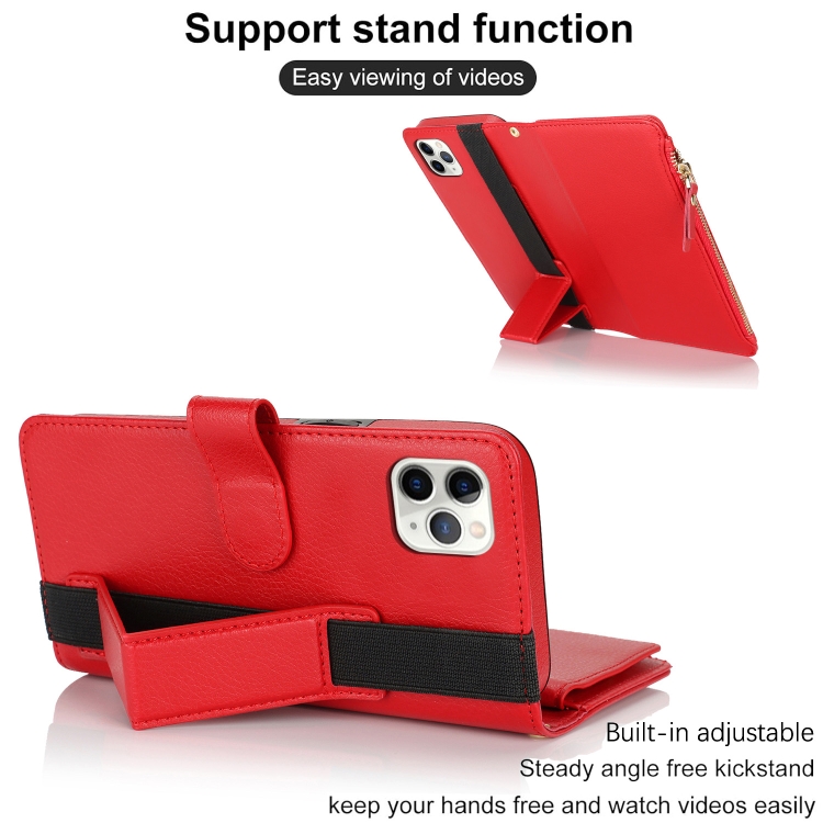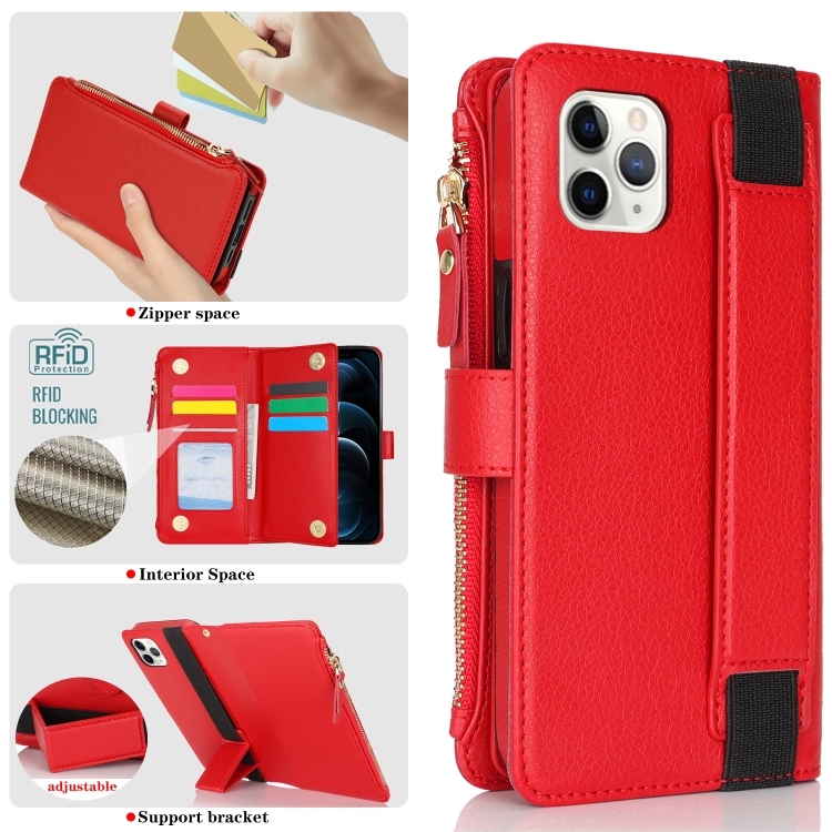 Funda de Cuero Rfid para Teléfono con Cierre de Cremallera y Soporte para Pulsera para iPhone 11 Pro Max (Rojo)