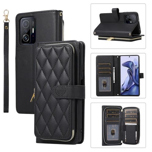 Funda de Cuero Tipo Billetera con Cremallera Completa y Diseño Rombal para Xiaomi Mi 11T/11T Pro (Negra)